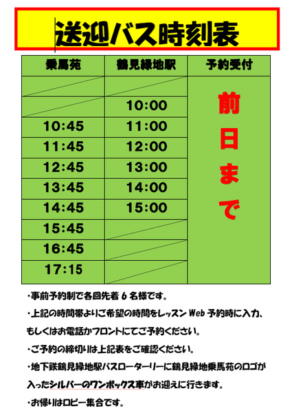いただき、送迎場所・時間メモにご希望場所(鶴見緑地駅もしくは乗馬苑)と時刻を